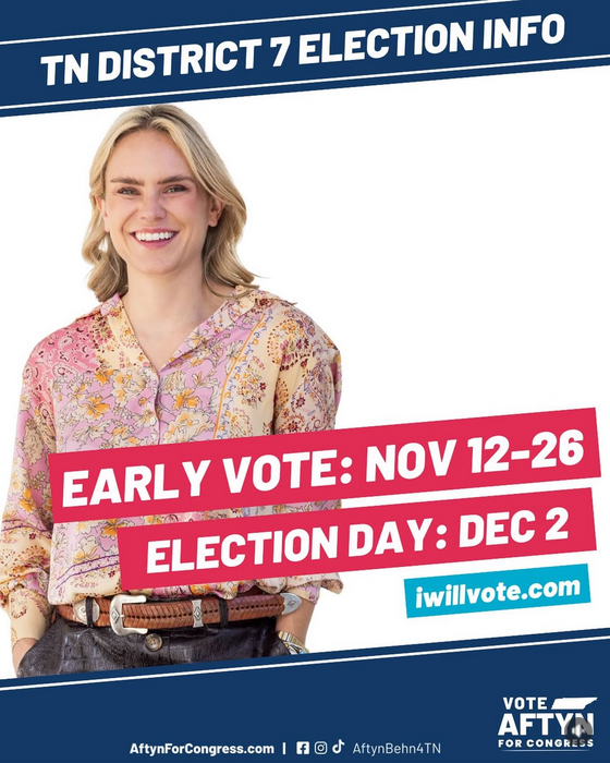 WHO!? Aftyn Behn is running for Tennessee’s District 7 in a special election DEC2. Once considered a hopless race, after the midterms an upset looks possible. In addition to the potential for a 0-vote margin in April (if we win three special elections, two of them longshots) there is also the “shot across the bow” even a close loss would send. This race wasn’t supposed to matter, but now it’s competitive!