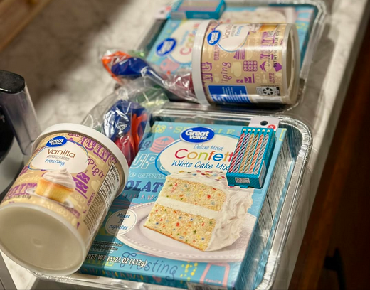 Fill a disposable cake pan filled with a box of cake mix, can of frosting, candles and lighter, and perhaps a small toy. Add a can of soda and a note explaining how it can replace eggs and oil, which can be hard to come by. Wrap it in cellophane with a festive bow. Families struggling with food insecurity often can’t afford even simple celebrations, but they deserve to make fun memories together, too. (You can probably think of other kits that might be useful, like soup kits.)