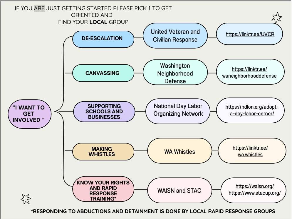 There are two basic ways to find a group to join. The first is to think about your lane. What issue do you want to work on, and what tactics do you want to take? The image above is a flowchart that shows how someone in Washington who wants to work on immigrant support can get involved, depending on the kind of action (tactics) they want to take. And this is just for immigration! There have never been more options for getting involved. Ask friends or progressive groups, or search Mobilize for your zip code to see what’s happening. Bookstores, libraries and art stores can also be good places to find out what’s happening.