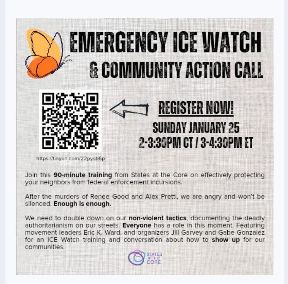 States at the Core was created by experts in resisting authoritarianism. They are holding a training in community organizing to resist ICE. NOTE: they do not record trainings, but do hold them regularly. If you cannot attend, see here for future dates. Next event: