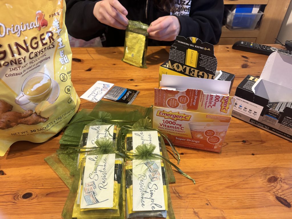 Stock up on tea during the next 2-for-1 sale, or buy in bulk at a restaurant supply store. Bigelow, Stash and Twinings all offer individually packaged bags. (Celestial does not.) Add honey-crystals from the Asian market or honey sticks from the farmer’s market. Emergen-C is cheap at Costco, but then you have five boxes…so share the savings! Make sure everything you include is individually sealed.