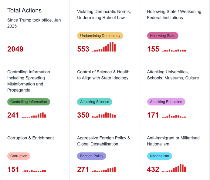 The more people know about Trump’s regime, the less they support it, but with all the disinformation these days it can be nerve wracking to share social media links. Built by a UK researcher, every item listed on the Trump Action Tracker has a link to verified reporting. Spend a little time browsing — you’ll learn new things. Share things that surprise you, or that have particular relevance to your community. Get the word out!